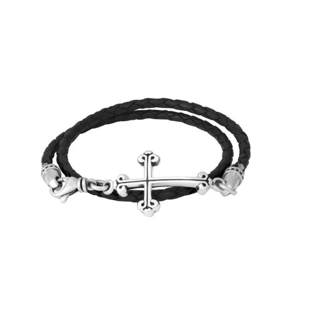 Sterling Silver Thin Braided Leather Traditional Cross Double Wrap Bracelet