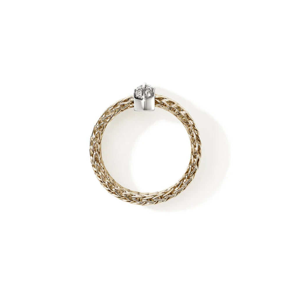 A seamless flat-weave ring with a low profile. Artisan handcrafted in reclaimed gold with ethically sourced diamonds.