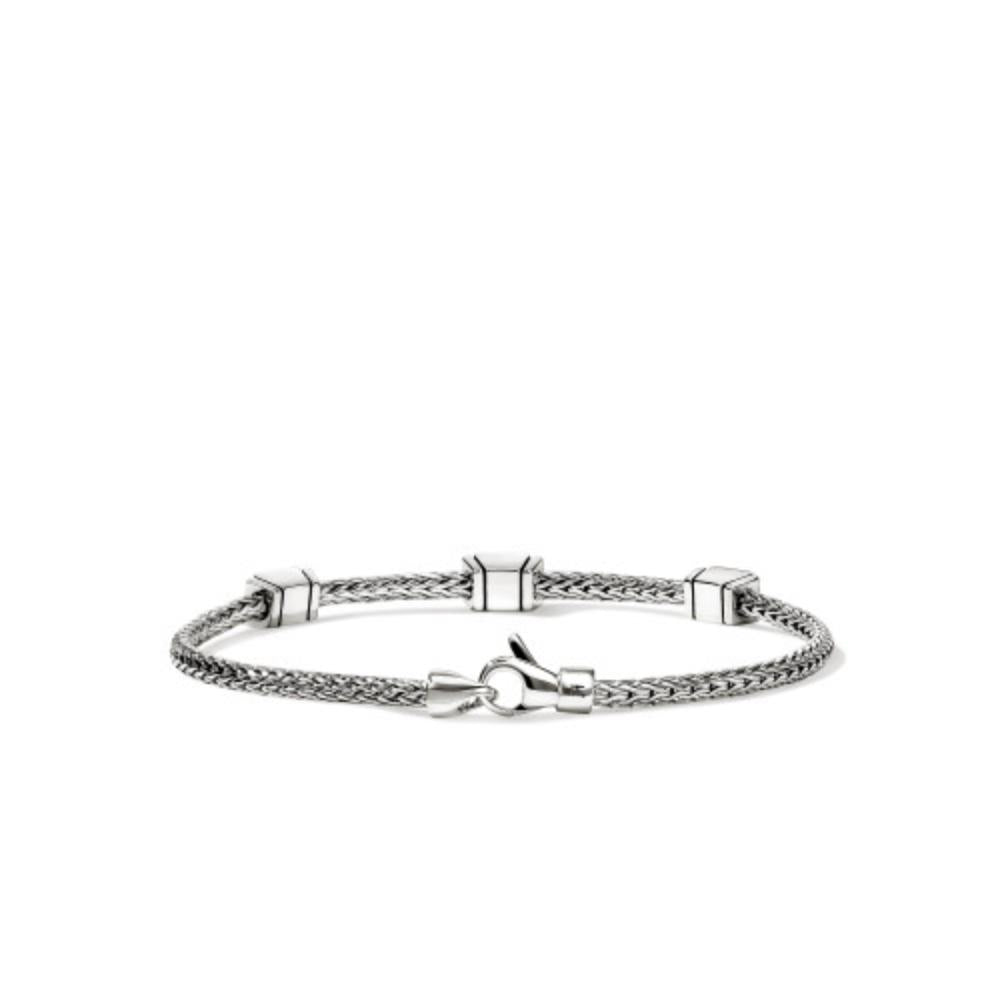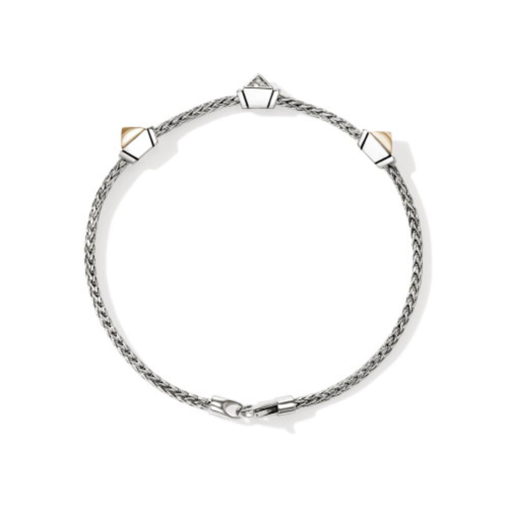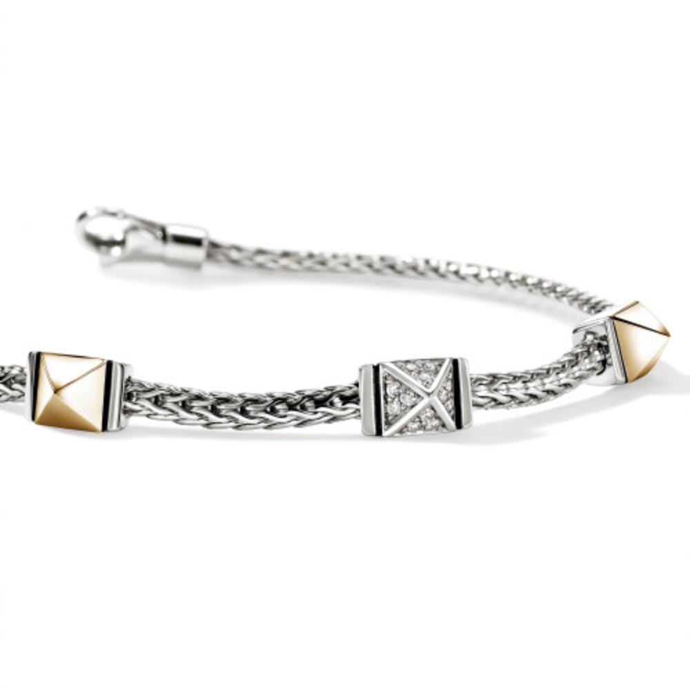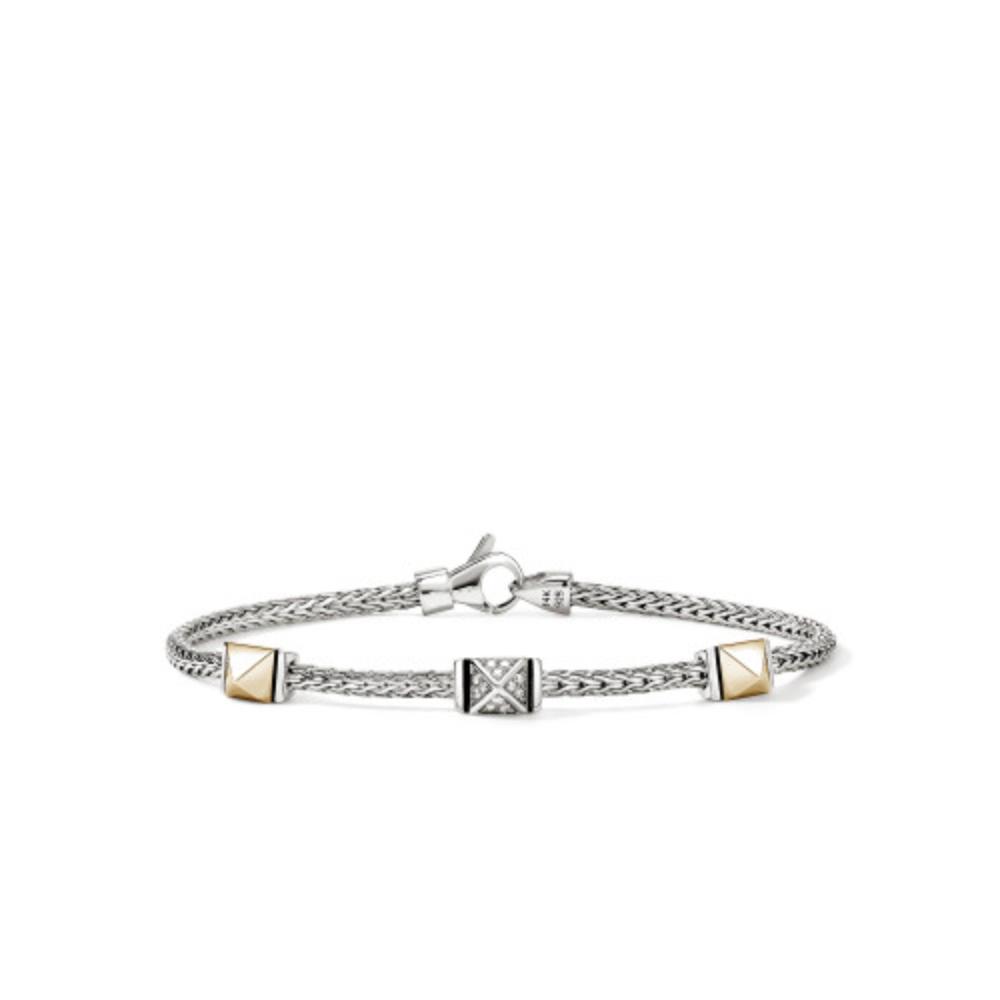 This exquisite John Hardy bracelet features a gleaming diamond (0.07ctw) pave icon stud station flanked by 2 yellow gold stations. Each station showcases meticulous craftsmanship strung on a 2.5mm silver woven chain. This piece offers versatile sophistication for both casual and formal occasions. The secure lobster clasp ensures your bracelet stays safely in place throughout the day.