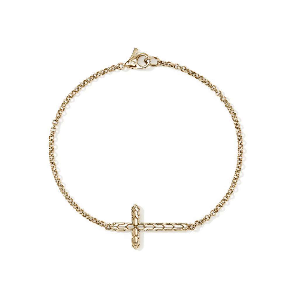 A minimalist cross bracelet in reclaimed gold. Artisan handcrafted. Size medium fits wrist measuring 6.26 - 6.75 inches.