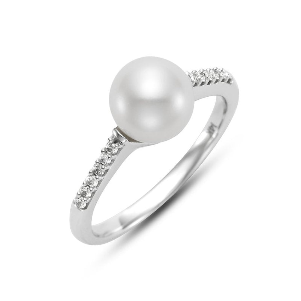 This exquisite ring is crafted from 14KTwhite gold and features a lustrous 7.5-8mm white freshwater pearl, beautifully complemented by 12 sparkling diamonds totaling 0.10 carats. The elegant design and timeless materials make it a perfect choice for adding a touch of sophistication to any outfit.