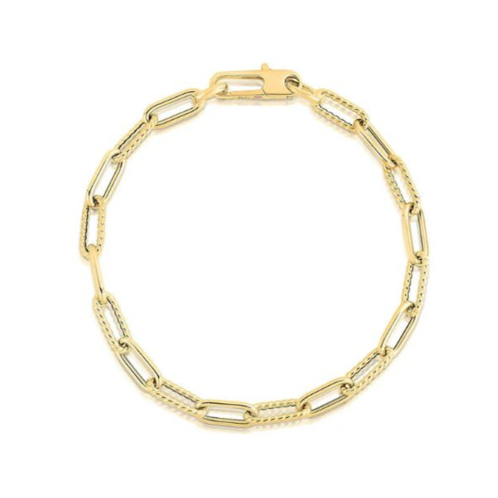 This Roberto Coin, Designer Gold Collection bracelet, features alternating smooth and fluted paper clip links crafted in 18K yellow gold. Bracelet measures 8.5 inches in length.