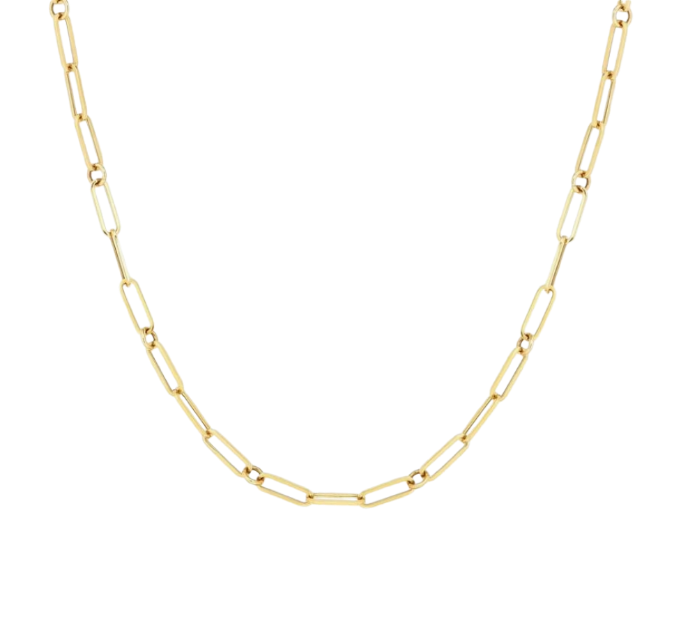 Sleek and versatile, this 18K gold necklace combines classic round links with modern paperclip links for a refined mix of texture and shape. Timeless and elegant, it can be worn alone as a statement piece or layered with other necklaces for a curated, contemporary look. Measures 17 inches in length.