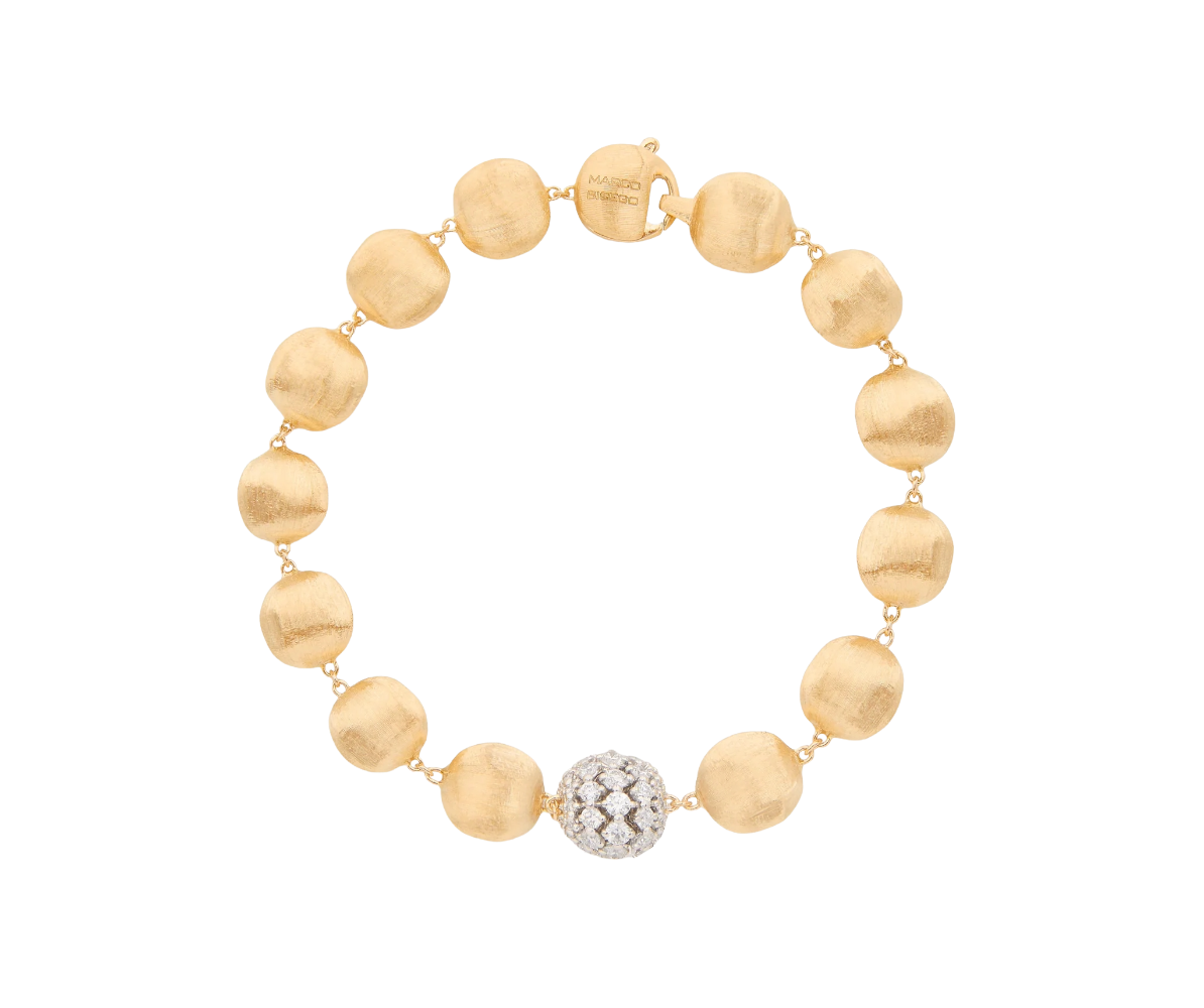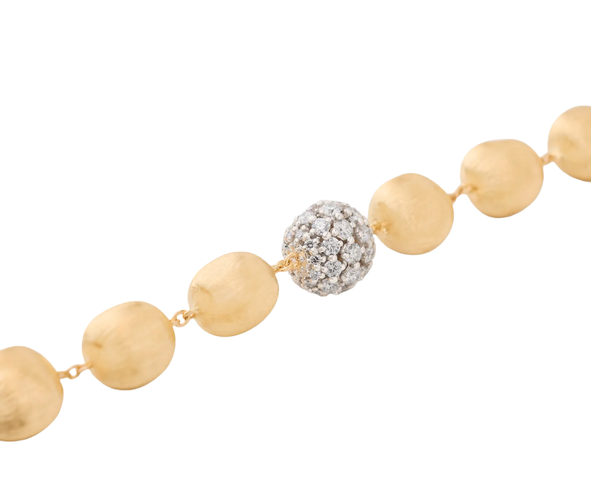 Elegant and timeless, this bracelet is handcrafted in Italy from 18K yellow gold and distinguished by softly rounded, hand-engraved beads inspired by natural forms. Each sphere is brushed with the Florentine bulino technique for a luminous, satin finish. A single diamond element adds subtle sparkle and sophistication, making it the perfect piece to elevate any look with refined Italian craftsmanship.