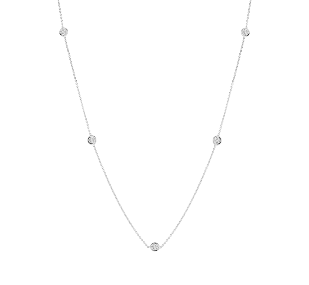 Crafted in 18K gold, this Diamonds by the Inch necklace features five sparkling diamond stations set along a fine chain. Each diamond catches the light with subtle brilliance, creating refined shimmer and understated elegance. Perfect for layering or wearing alone, this necklace offers timeless style and versatile sophistication for any jewelry collection.