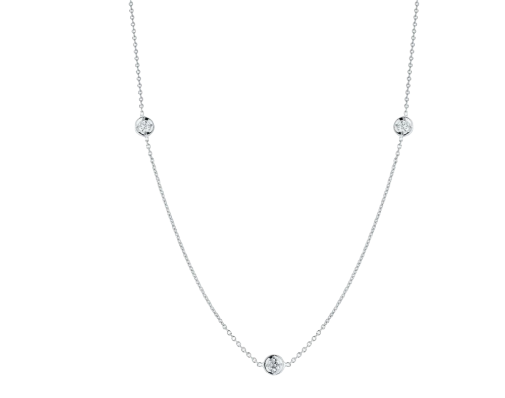 Crafted in 18K white gold, this Diamonds by the Inch necklace features three sparkling diamond stations set along a fine chain. Each diamond catches the light with subtle brilliance, creating refined shimmer and understated elegance. Perfect for layering or wearing alone, this necklace offers timeless style and versatile sophistication for any jewelry collection.