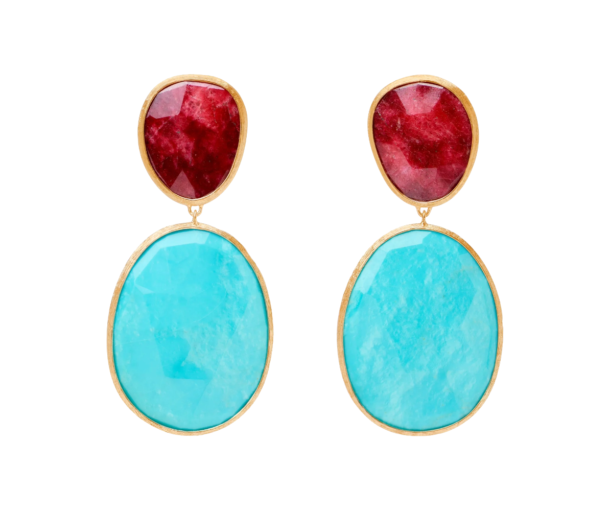 These drop earrings seamlessly combine bold volume with everyday elegance. The carefully selected red thulite and turquoise are beautifully set in delicate 18K yellow gold bezels, each meticulously hand-engraved using the ancient Florentine technique. The perfect finishing touch to add a splash of color to any outfit.