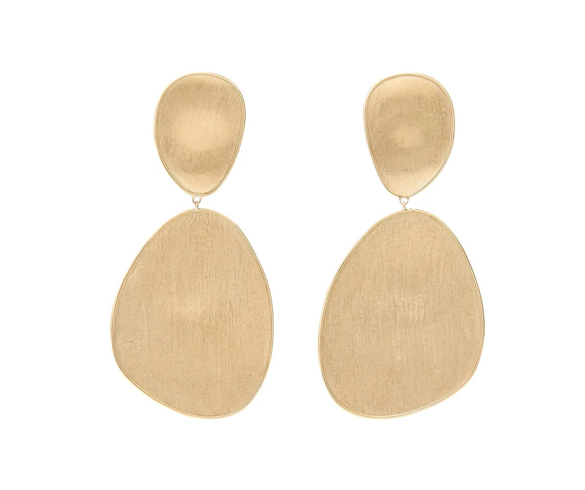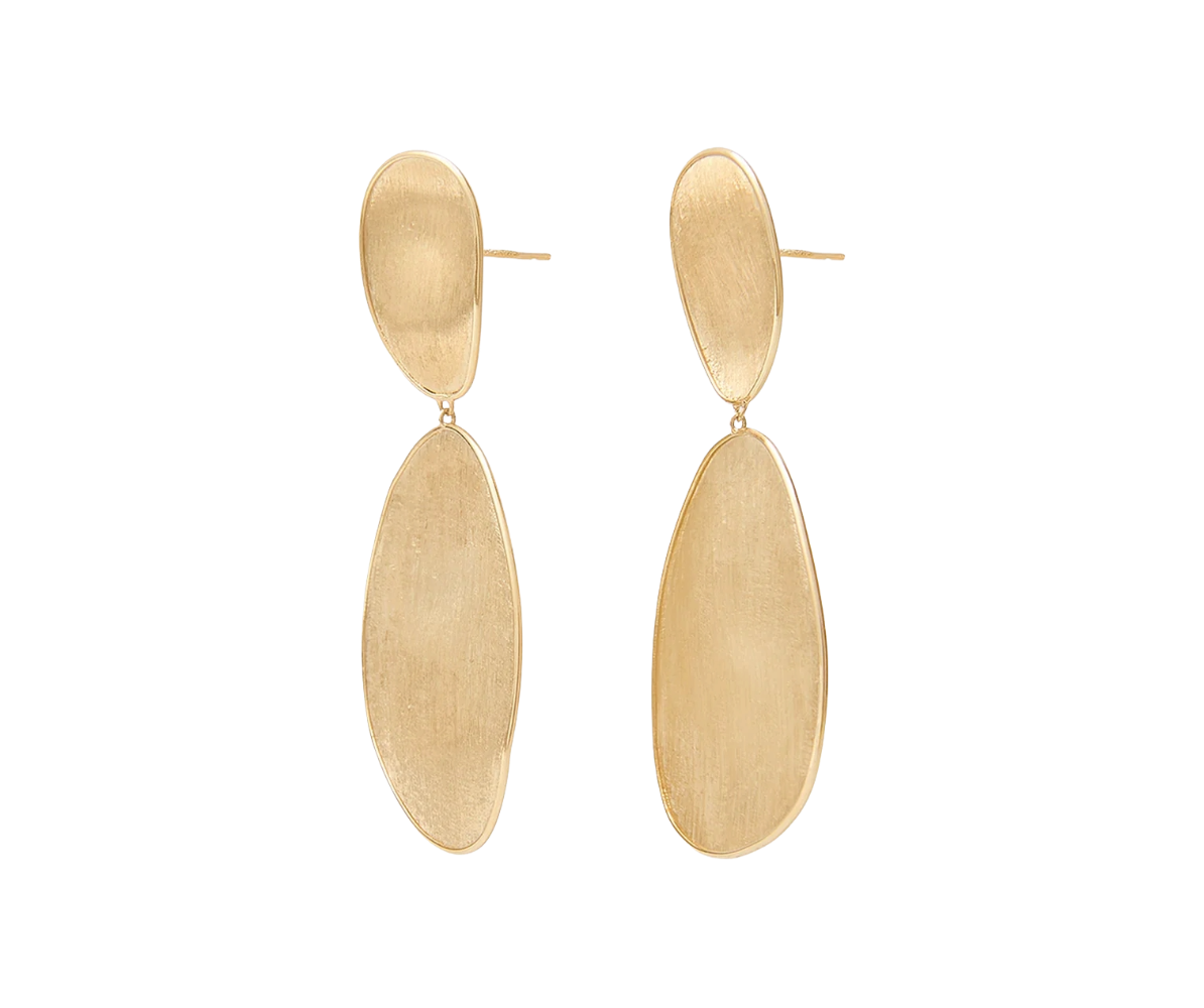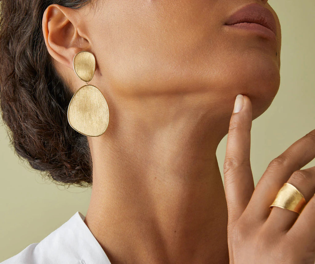Handcrafted in 18K yellow gold, the Lunaria Double Drop Earrings feature a cascading, chandelier-style silhouette with delicate leaf-shaped elements. Each leaf is hand-engraved using the traditional Florentine Bulino tool, producing a soft, brushed finish that catches light beautifully. Lightweight yet striking, these earrings are ideal for formal occasions or as an elevated statement in daily wear. Their airy design reflects the flowing beauty of the Lunaria plant, combining timeless Italian craftsmanship with sculptural elegance.