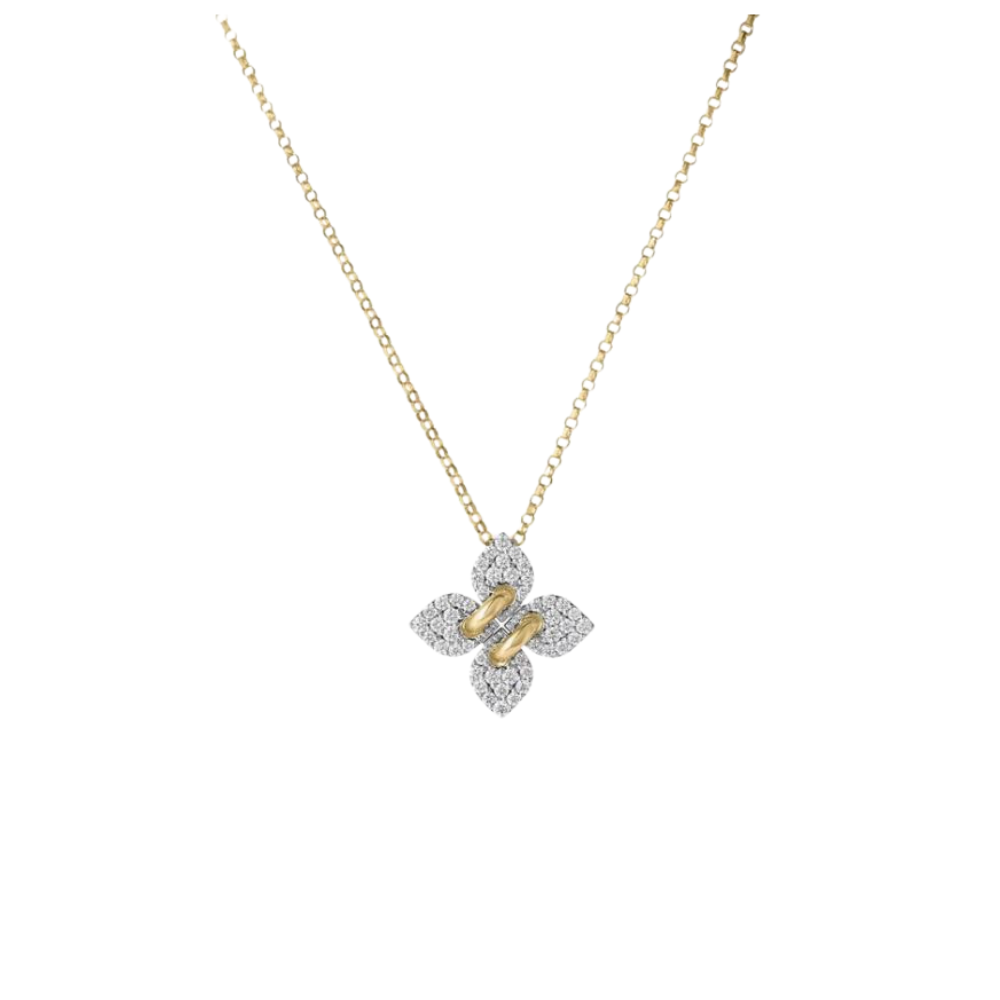 Expertly crafted in 18K yellow and white gold, this Love in Verona necklace features an intricate flower pendant sparkling from its pavé diamond finish. The elegant flower rests gracefully on a petite yellow gold chain, offering a refined touch to any outfit. Perfect for adding subtle brilliance and timeless charm to your collection.