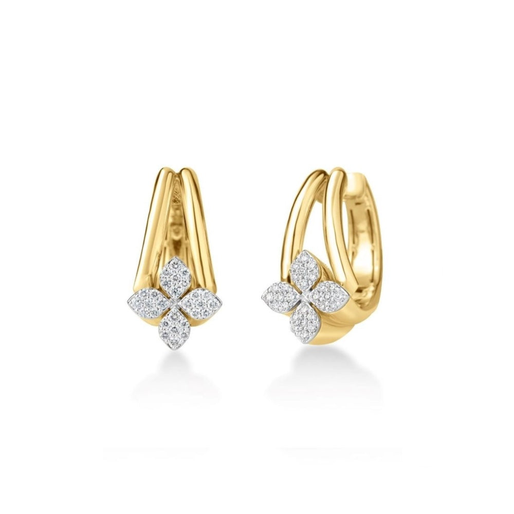 These 18K Gold Love in Verona Small Double Hoop Earrings combine timeless elegance with modern design. Crafted from 18K yellow gold, they are delicately set with round diamonds totaling approximately 0.26 carat, adding a subtle sparkle. Their refined silhouette makes them perfect for elevating any ensemble with understated sophistication.