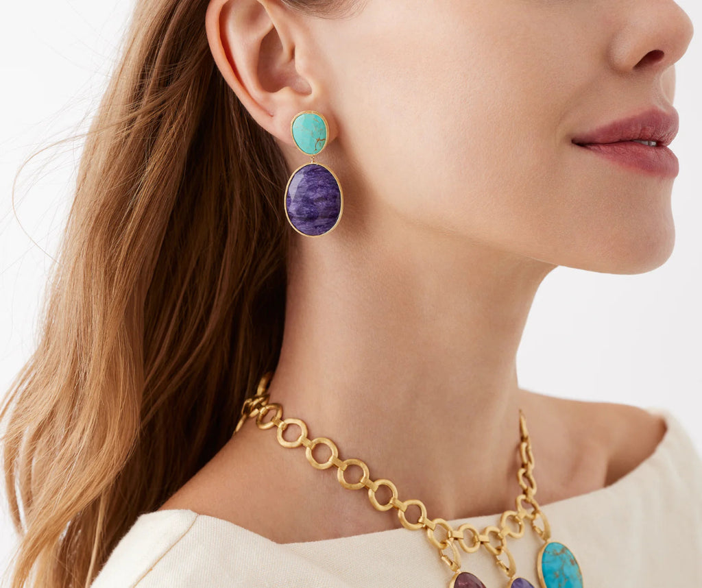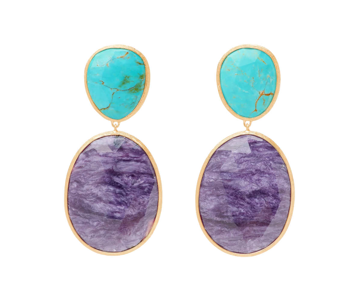 These drop earrings seamlessly combine bold volume with everyday elegance. The carefully selected turquoise and purple charoite are beautifully set in delicate 18K yellow gold bezels, each meticulously hand-engraved using the ancient Florentine technique. The perfect finishing touch to add a splash of color to any outfit.
