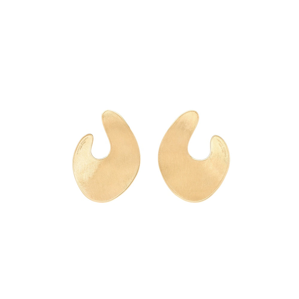 Crafted in 18K yellow gold, these sculptural earrings showcase a bold, curved silhouette that softly wraps the ear. Their hand-engraved satin finish brings a warm, luminous texture, while the open, abstract shape offers a modern interpretation of organic form. A confident statement of refined Italian design—elevated yet wearable for both day and evening.