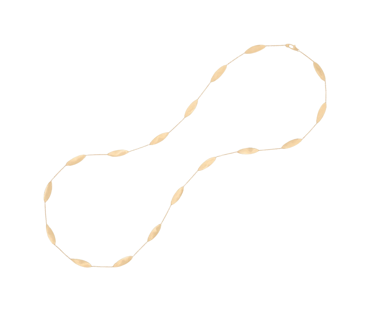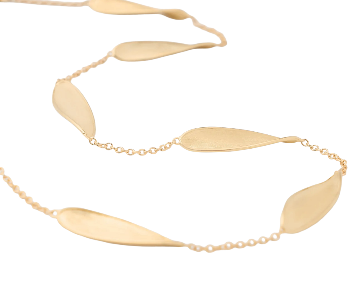 A refined expression of the iconic Lunaria motif, this 18K yellow gold long necklace showcases a sequence of gently twisted leaf elements, hand-engraved using the ancient Florentine technique. The alternating chain provides fluidity, making it a graceful and sculptural accent to both casual and formal looks.