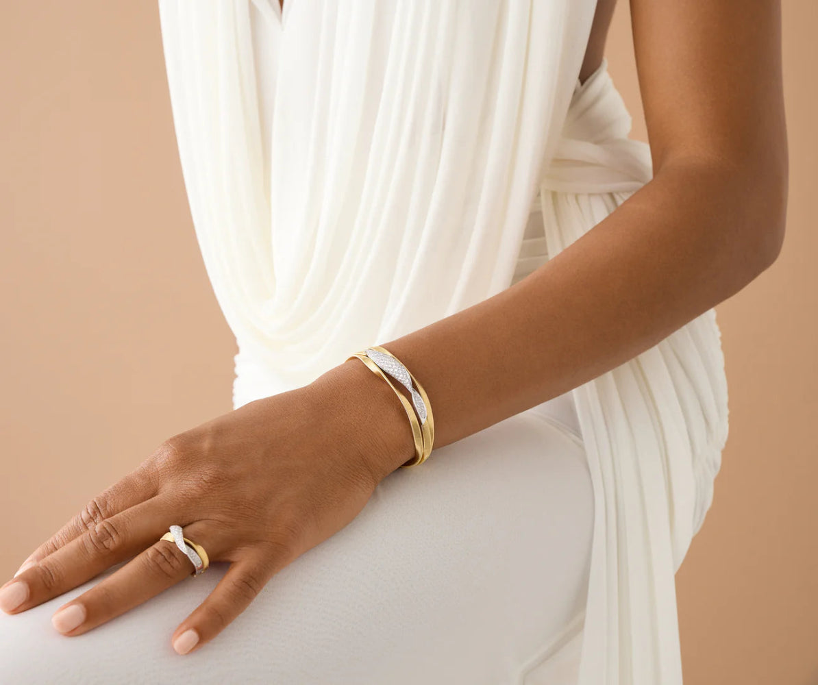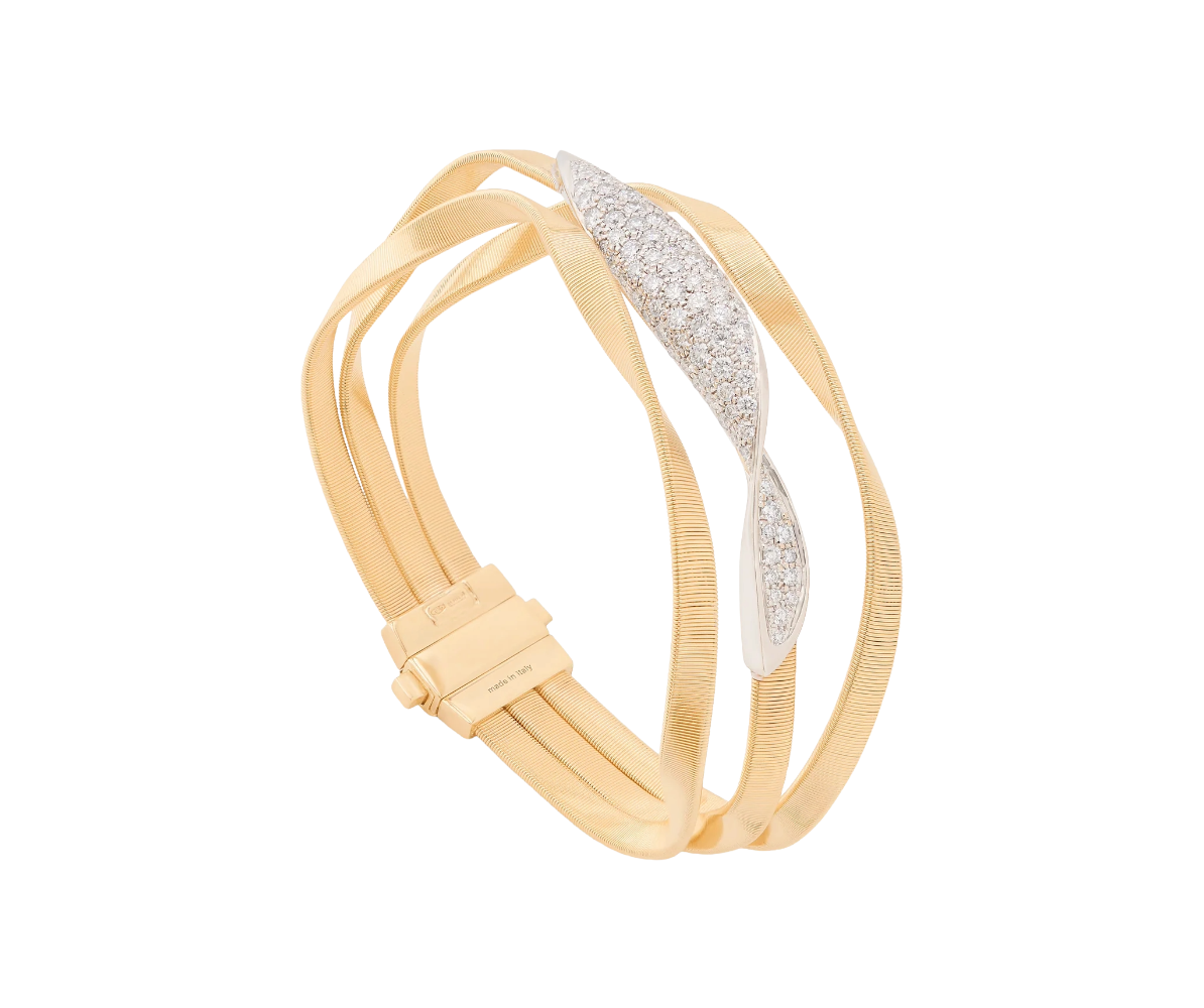 This Marrakech bracelet features multiple strands of hand-twisted 18K yellow gold coils, gathered with a sculptural pavé diamond crossover accent. Crafted in Italy, the layered design creates movement and dimension while maintaining the collection’s signature tactile texture. A luminous piece that embodies artisanal craftsmanship and modern elegance.