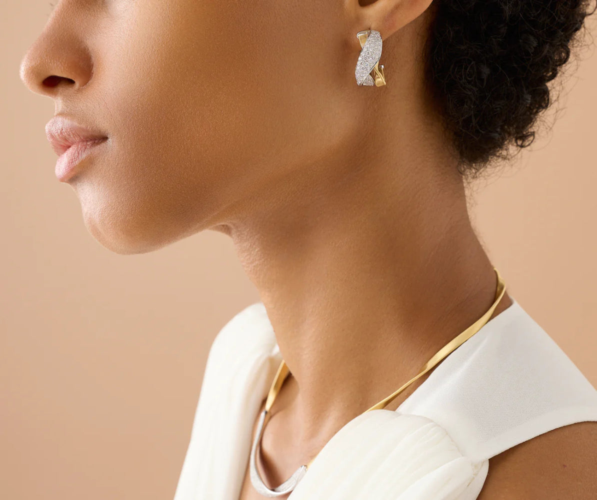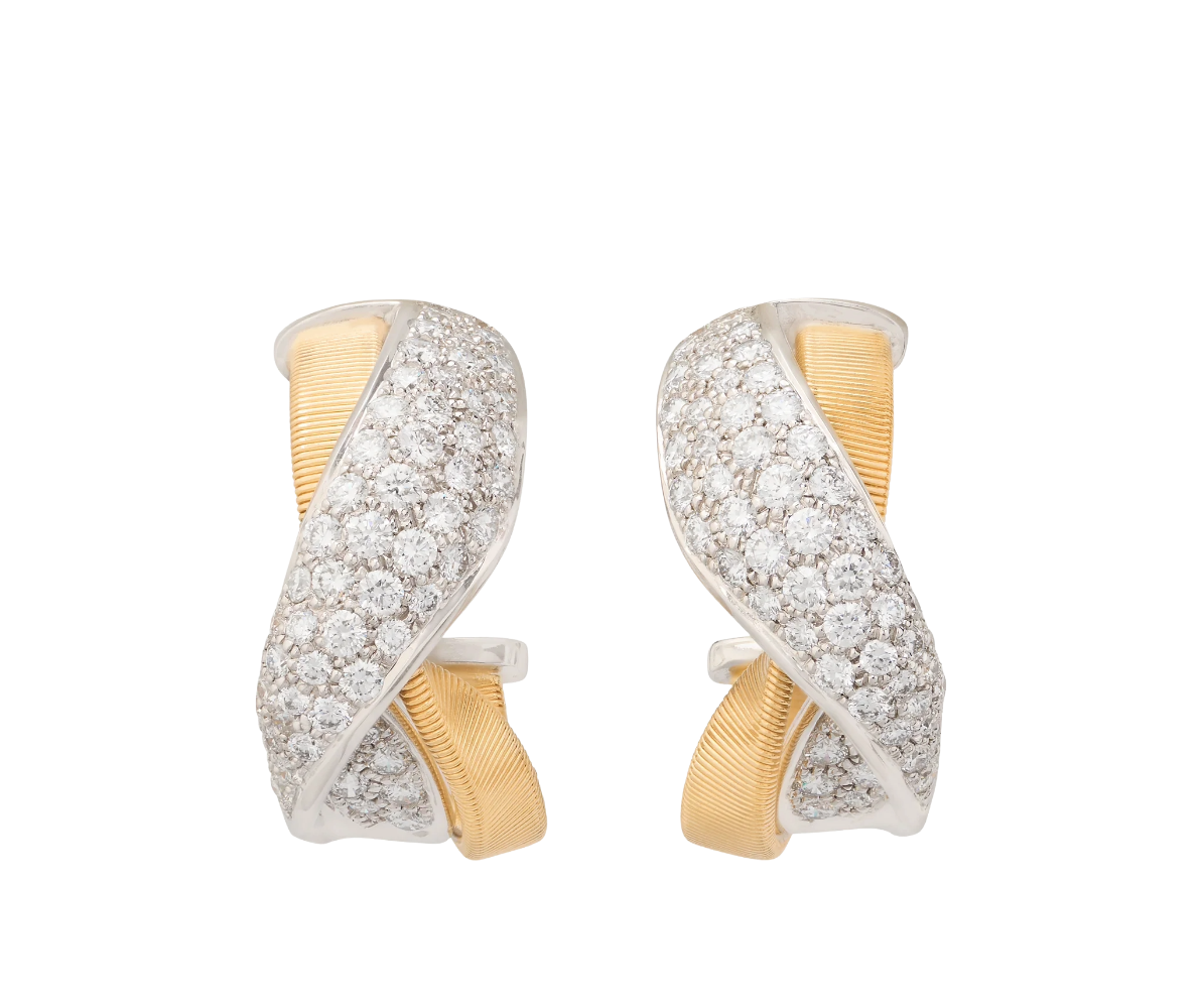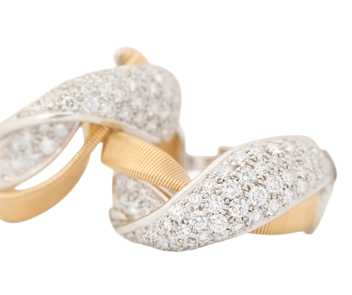 These Marrakech hoop earrings blend hand-twisted 18K yellow gold coils with a sculptural twisted pavé diamond design. Rows of brilliant-cut diamonds wrap gracefully around the crossover, catching light from every angle. Italian-made, this bold yet timeless design showcases luxurious texture and radiant sparkle, perfect for both day and evening wear.