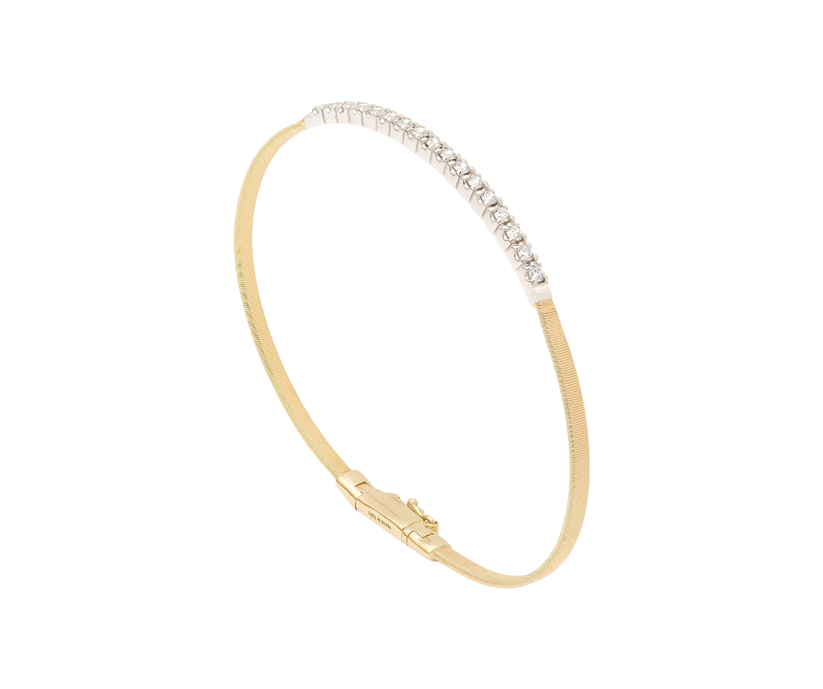 The linear elegance of our coil meets the light of diamonds. Crafted in 18K yellow gold with the brand’s exclusive coil technique, this single strand flat coil features a brilliant-cut diamond bar. The timeless classic grants any outfit a touch of radiance. Size 7.25".
