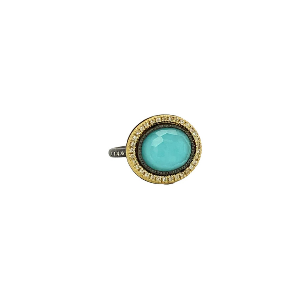 18K Yellow Gold and Blackened Sterling Silver Oval, Natural Turquoise Doublet with Champagne Diamond Halo. (0.27 TCW).
