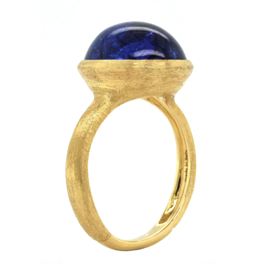 Discover the enchanting allure of this 18K yellow gold ring featuring a stunning oval cabochon tanzanite stone. Crafted by renowned designer Marco Bicego, this piece showcases the brand's signature artisanal quality and attention to detail. The rich, velvety blue-violet tanzanite is elegantly set in lustrous 18K gold, creating a sophisticated statement piece. Perfect for those seeking a unique gemstone ring that combines timeless elegance with contemporary design.