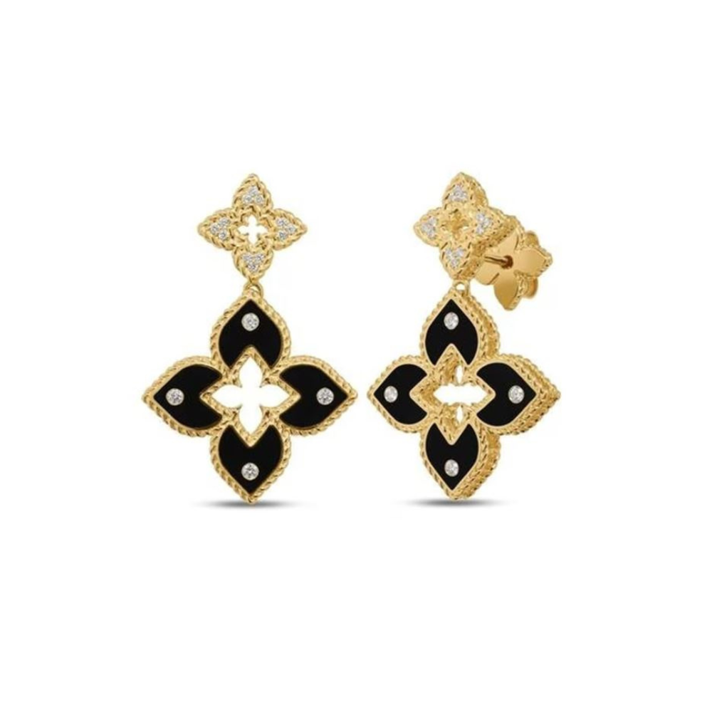 Elegant 18K yellow gold post earrings featuring Roberto Coin's signature Venetian Princess design. Each earring showcases a delicate flower motif adorned with lustrous black enamel and sparkling diamonds totaling 0.12 carats. The timeless combination of rich gold, striking black enamel, and brilliant diamonds creates a sophisticated accessory perfect for both everyday elegance and special occasions. Secure post backs ensure comfortable, all-day wear.