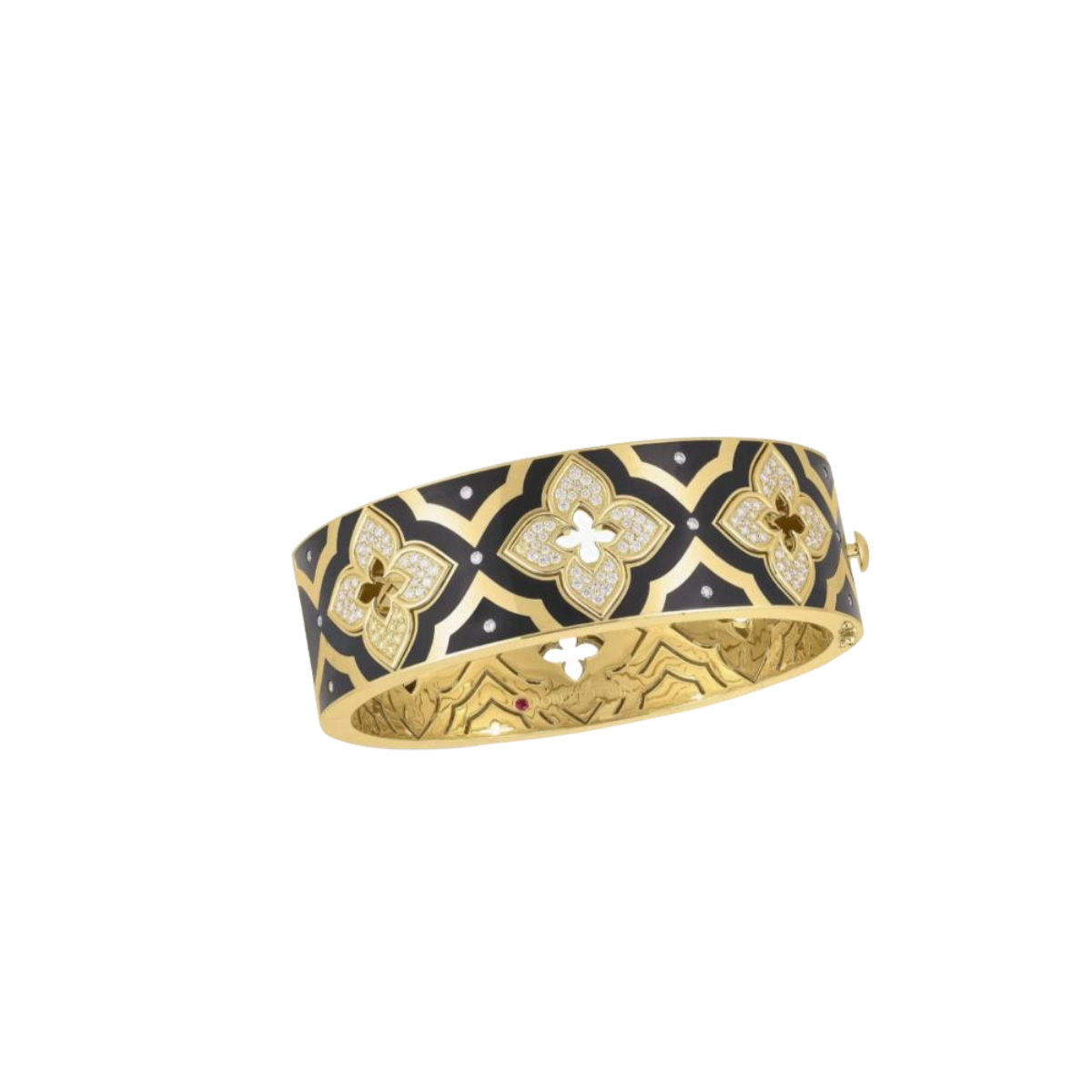 Bold and contemporary, this Venetian Princess wide bangle is crafted in 18K yellow gold and features the collection's iconic floral motif, accented with brilliant diamonds and sleek enamel. Its wide design offers a beautiful canvas to showcase the timeless Italian craftsmanship and artistry of Roberto Coin. Sophisticated yet classic, this bangle is perfect for wearing alone or layering with other pieces for a more sophisticated look.