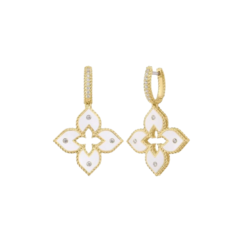 Elegant 18K yellow gold drop earrings featuring Roberto Coin's signature Venetian Princess design. Each earring showcases lustrous white enamel detailing paired with sparkling diamonds totaling 0.20 carats. The refined craftsmanship and timeless aesthetic make these earrings a sophisticated addition to any jewelry collection. Perfect for both everyday elegance and special occasions.