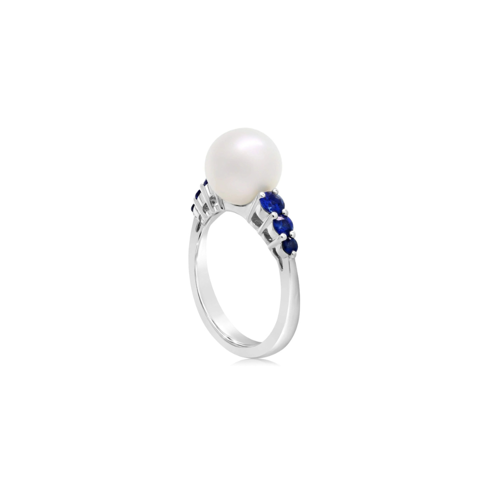 Elevate your elegance with this stunning 18K white gold ring by Mikimoto, showcasing a lustrous 9MM A+ white South Sea pearl as the centerpiece. Six brilliant blue sapphires totaling 0.70 carats frame the pearl in sophisticated splendor. This timeless design combines the organic beauty of premium South Sea pearls with the rich color of fine sapphires.