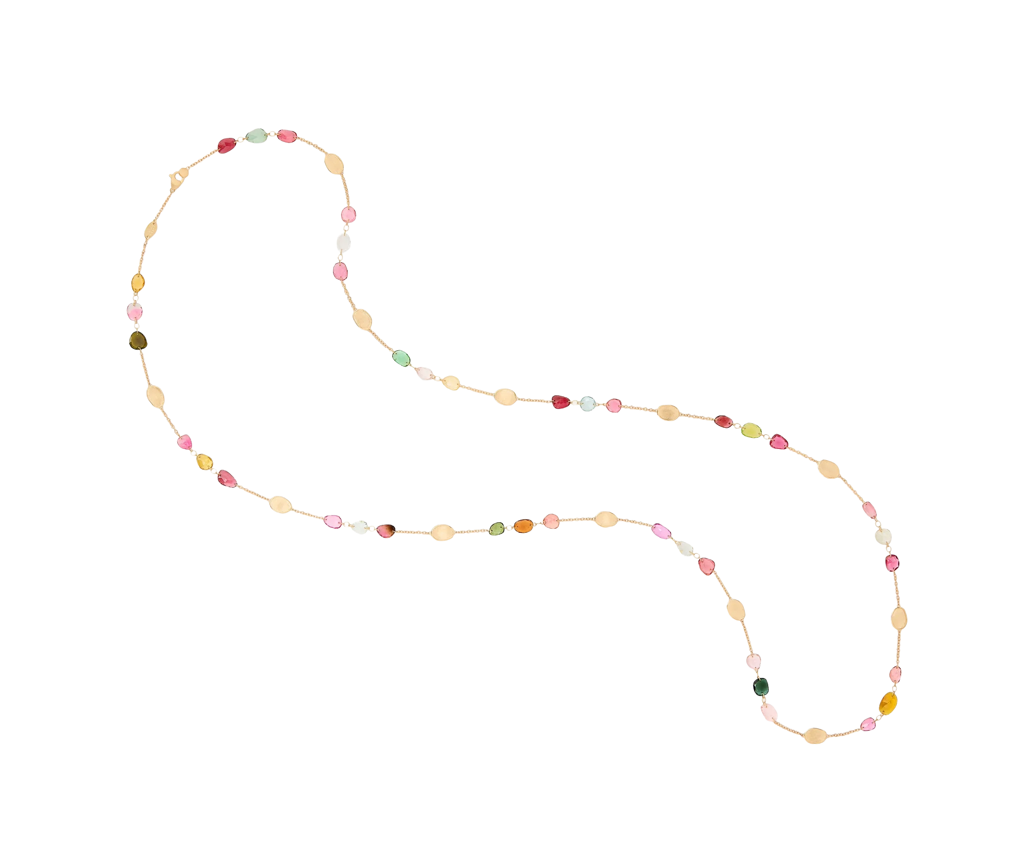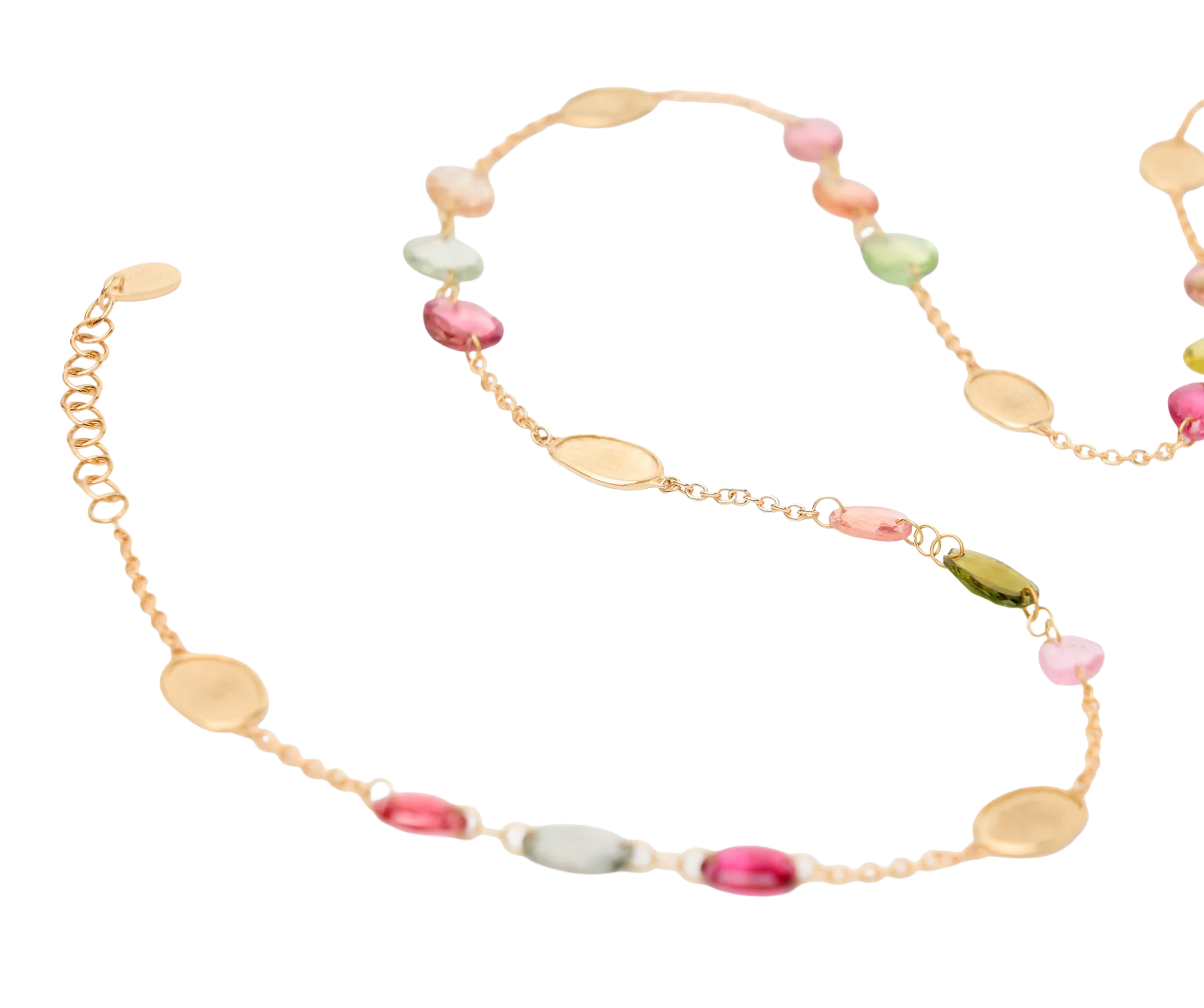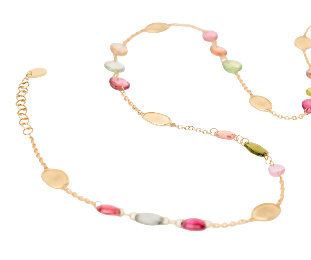 An elegant 18K yellow gold long necklace, adorned with gold leaves delicately hand-engraved using the ancient Florentine technique, alternating with vibrant tourmalines. The perfect jewel to infuse any ensemble with a sophisticated touch of color.
