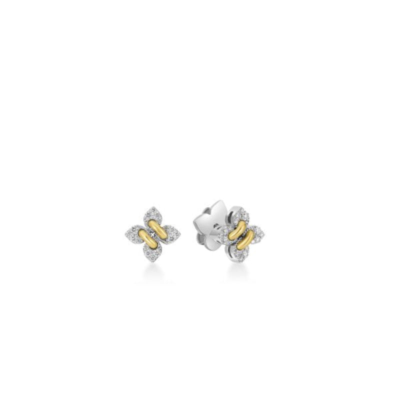 These 18K yellow & white gold stud earrings from Roberto Coin feature a delicate flower design measuring approximately 10mm. Each earring is adorned with petite pave diamonds totaling around 0.17 carats, secured with a post and butterfly back for comfortable, secure wear. The blend of white and yellow gold enhances their elegant appeal, making them a refined choice for everyday sophistication or special occasions.