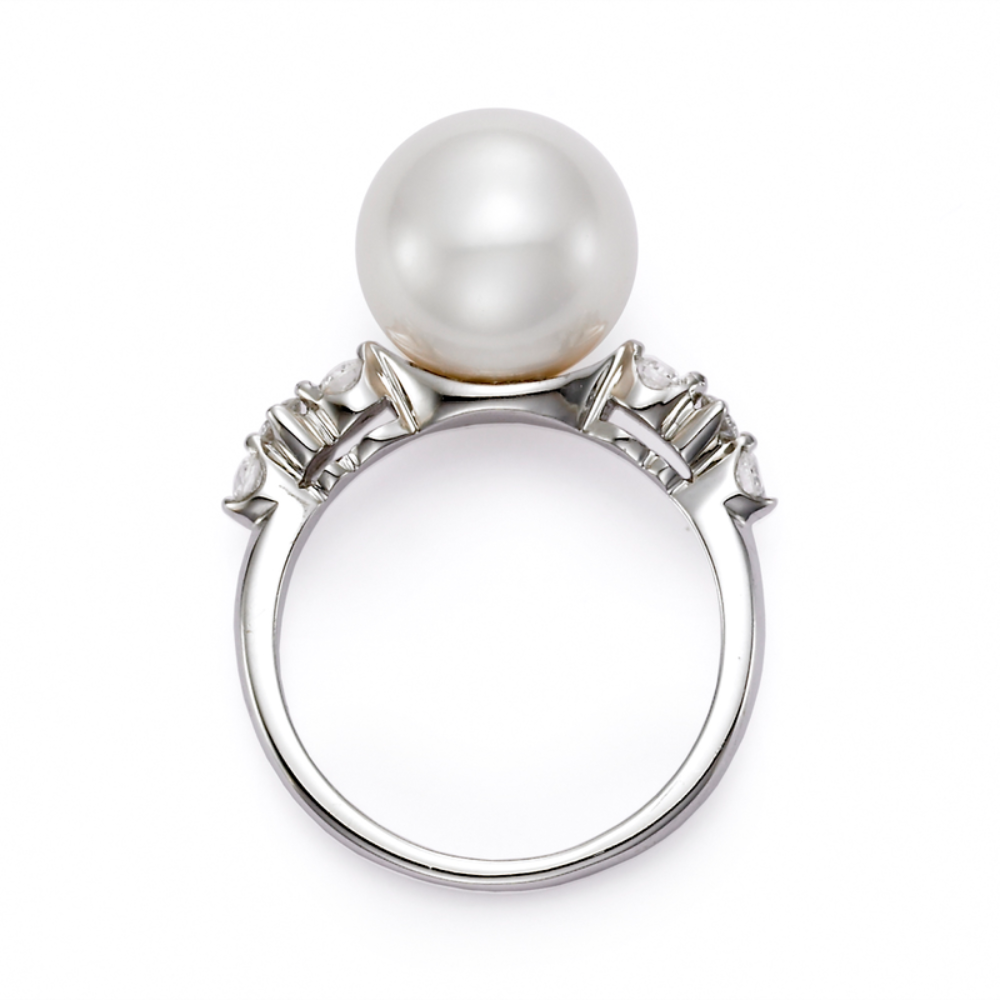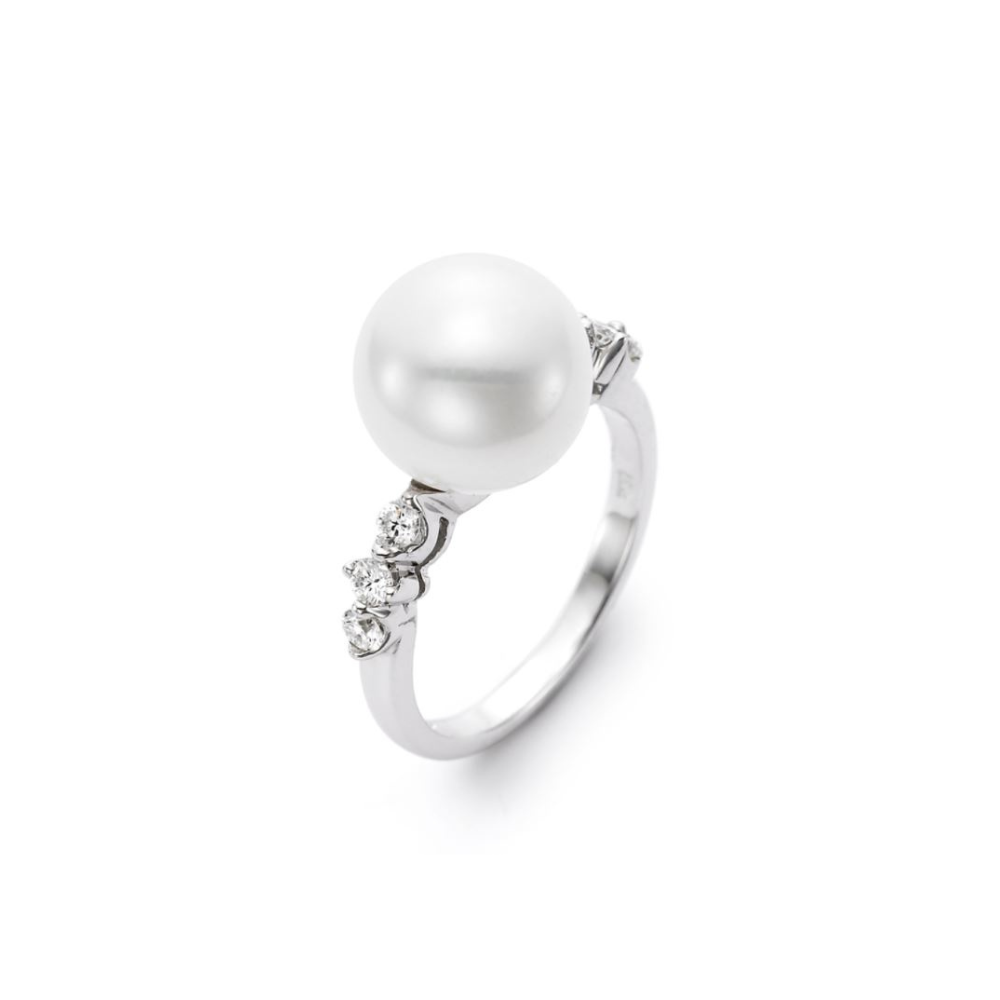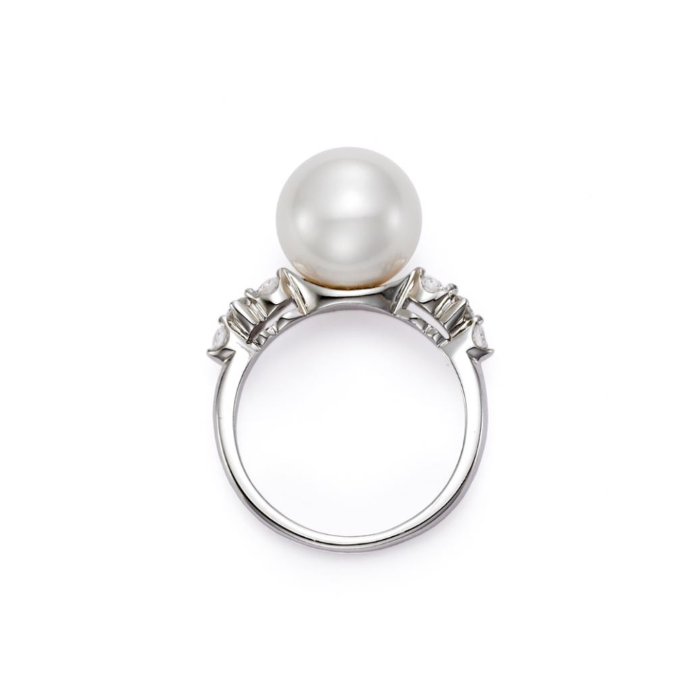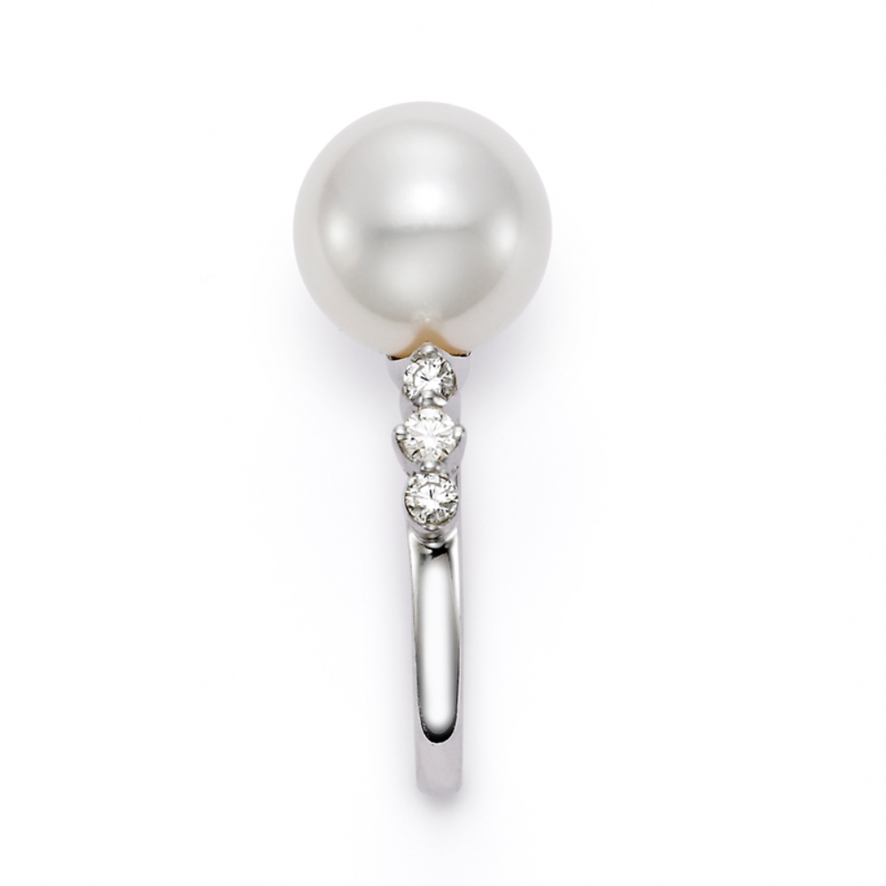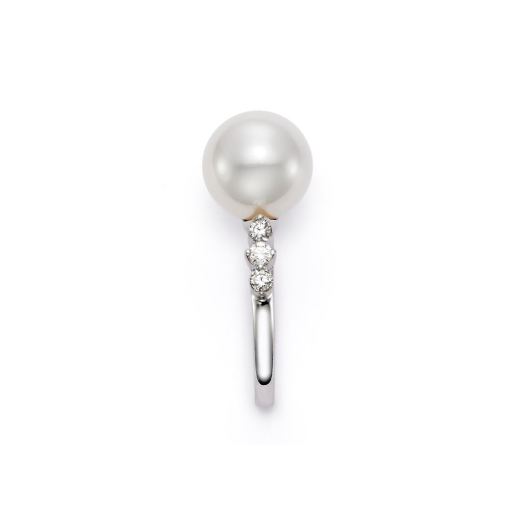 This exquisite ring features a lustrous 9-9.5mm white freshwater pearl set in 18KT white gold, complemented by six sparkling diamonds totaling 0.27 carats. The elegant design makes it a perfect choice for adding a touch of sophistication to any outfit.