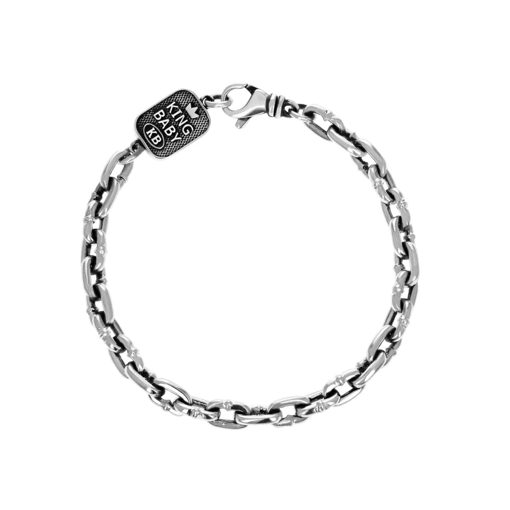 Crafted in the USA, this Sterling Silver Boat Link Bracelet features elegantly sized links measuring approximately 6mm wide by 10mm long. The bracelet is secured with a distinctive King Baby tag and lobster clasp, combining refined style with reliable wearability. Its timeless design adds a sophisticated touch to any ensemble. Measures 8.75".
