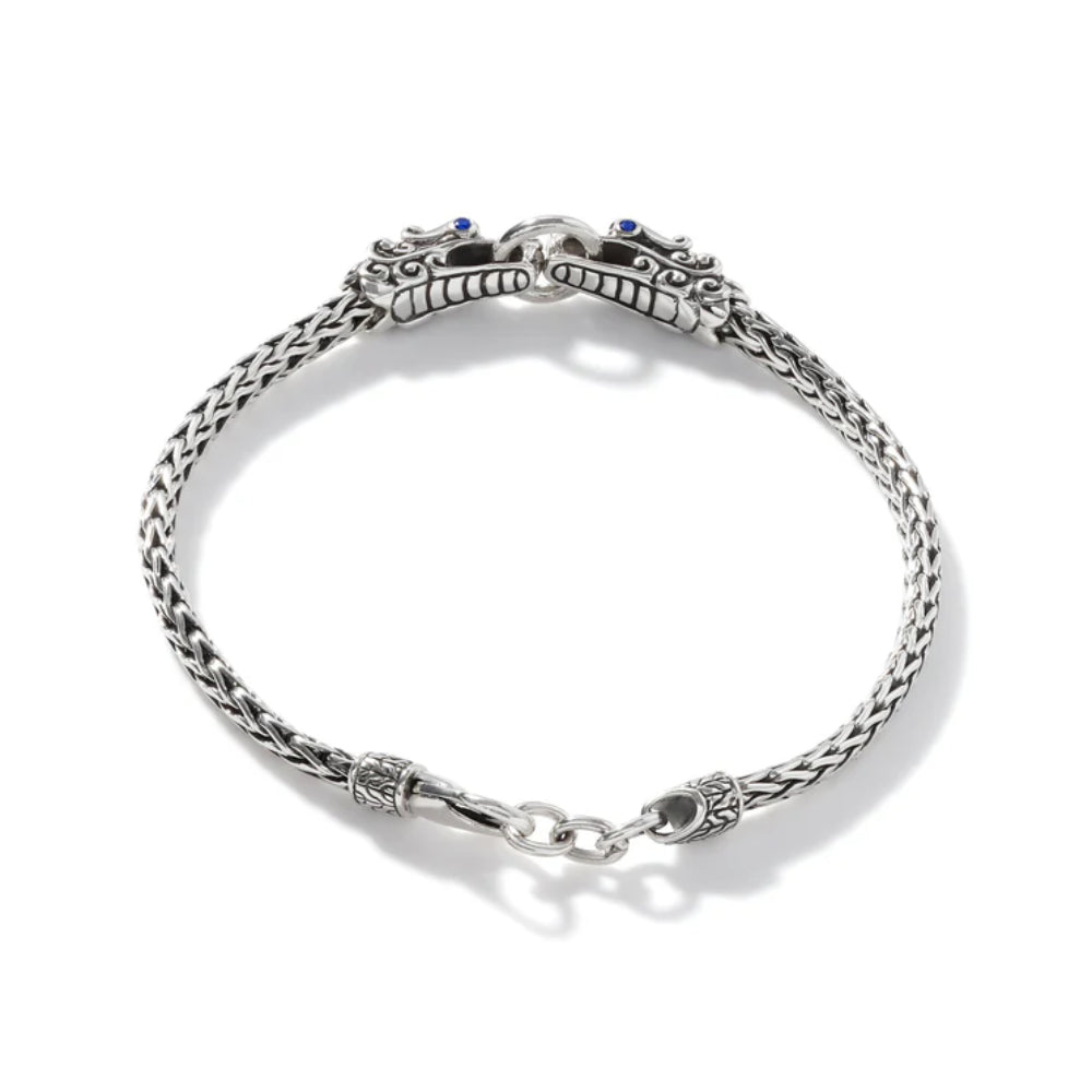 This exquisite bracelet showcases our hand-carved Naga dragon, symbolizing love, protection, and prosperity. Crafted by skilled artisans from reclaimed sterling silver, it features two Naga Dragons with bezel-set blue sapphire eyes, adding a touch of elegance. Embrace a meaningful accessory that blends artistry with timeless symbolism.