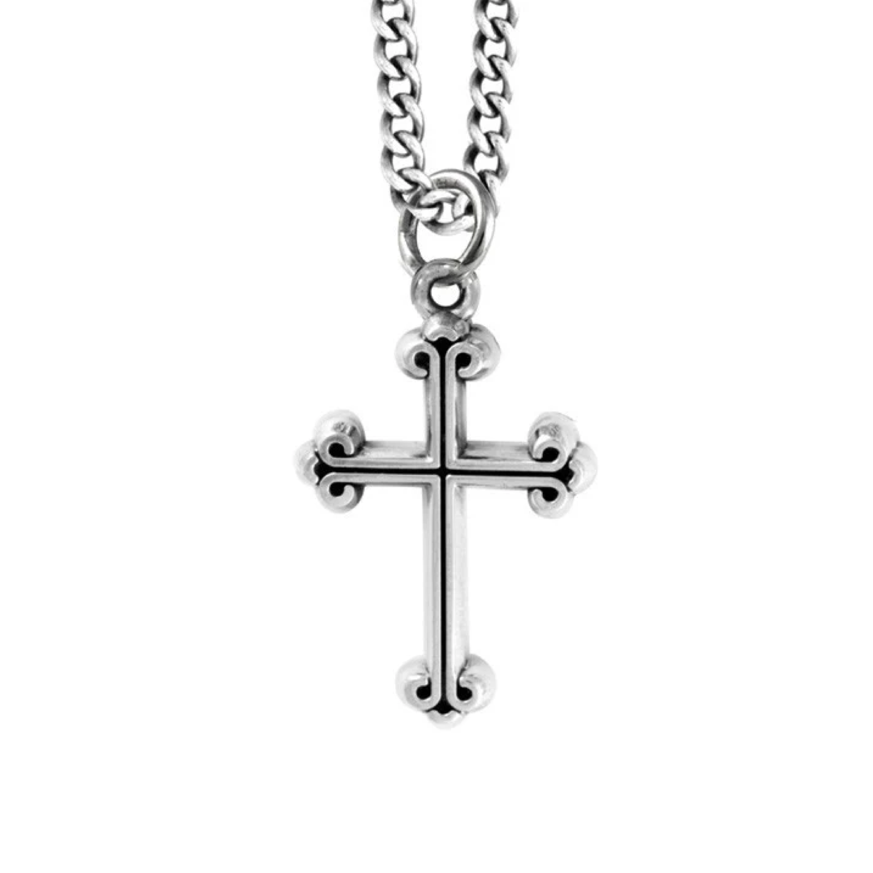 Crafted from .925 sterling silver, this extra small traditional cross pendant offers refined simplicity. Available with a 24" curb-link chain secured by a lobster clasp, the cross measures 37mm by 23mm . Handmade in the USA, this pendant combines timeless design with durable craftsmanship, making it a subtle yet meaningful addition to any jewelry collection.