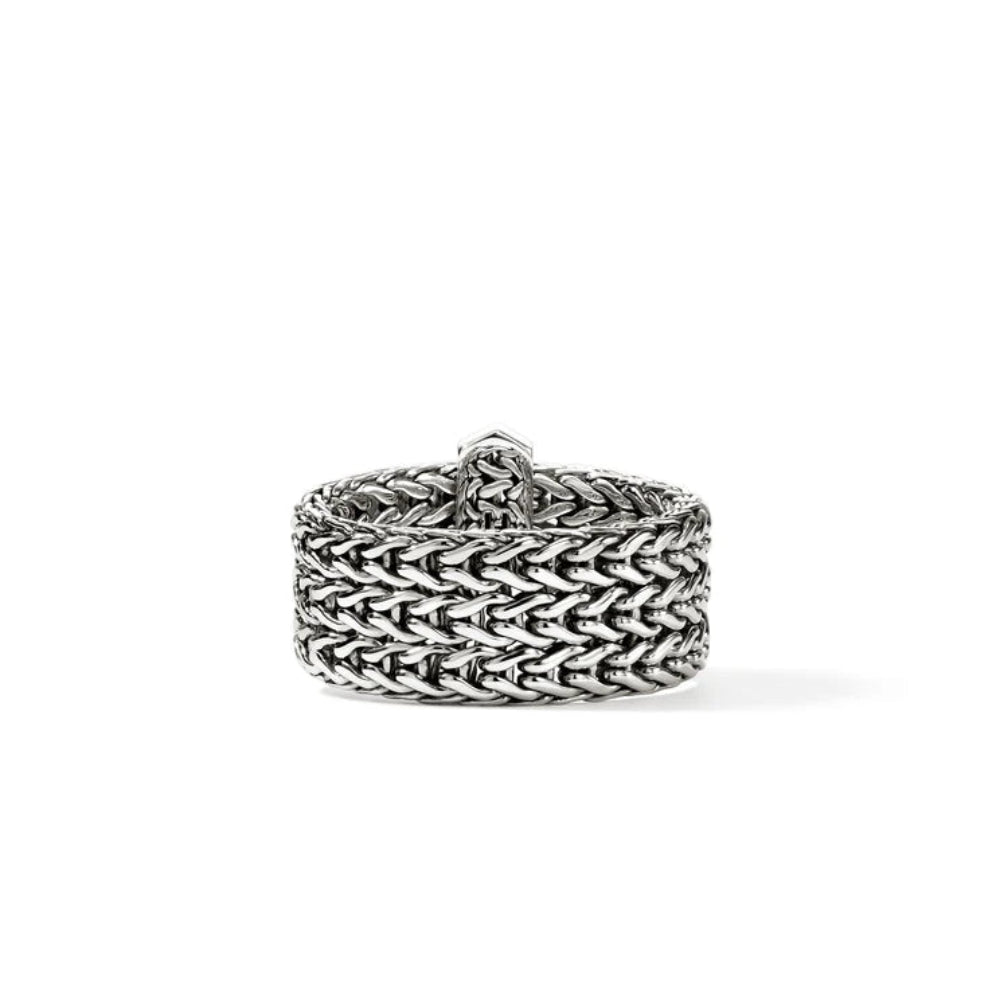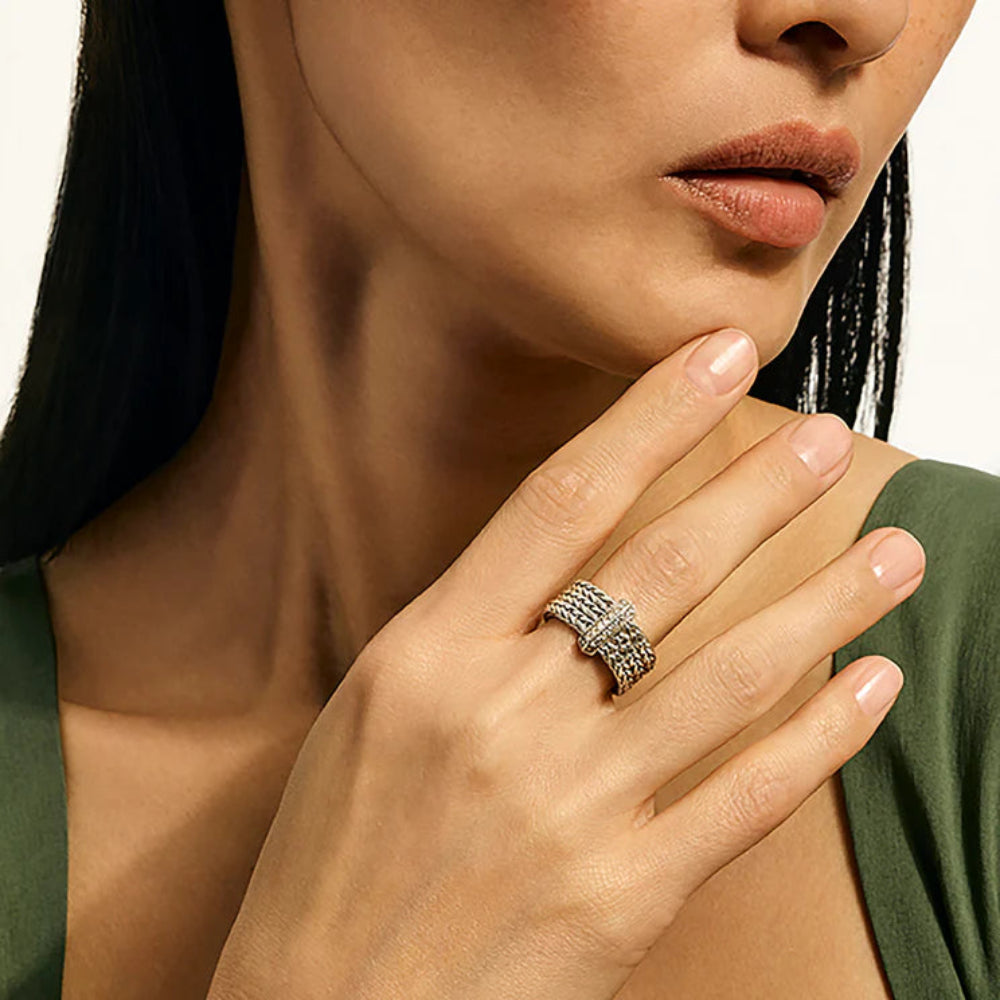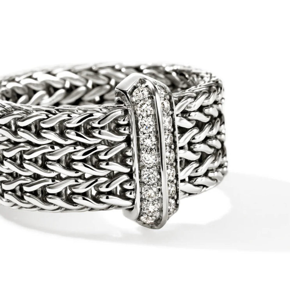 A seamless flat-weave ring with a low profile. Artisan handcrafted in reclaimed sterling silver with ethically sourced diamond