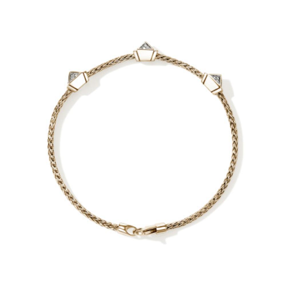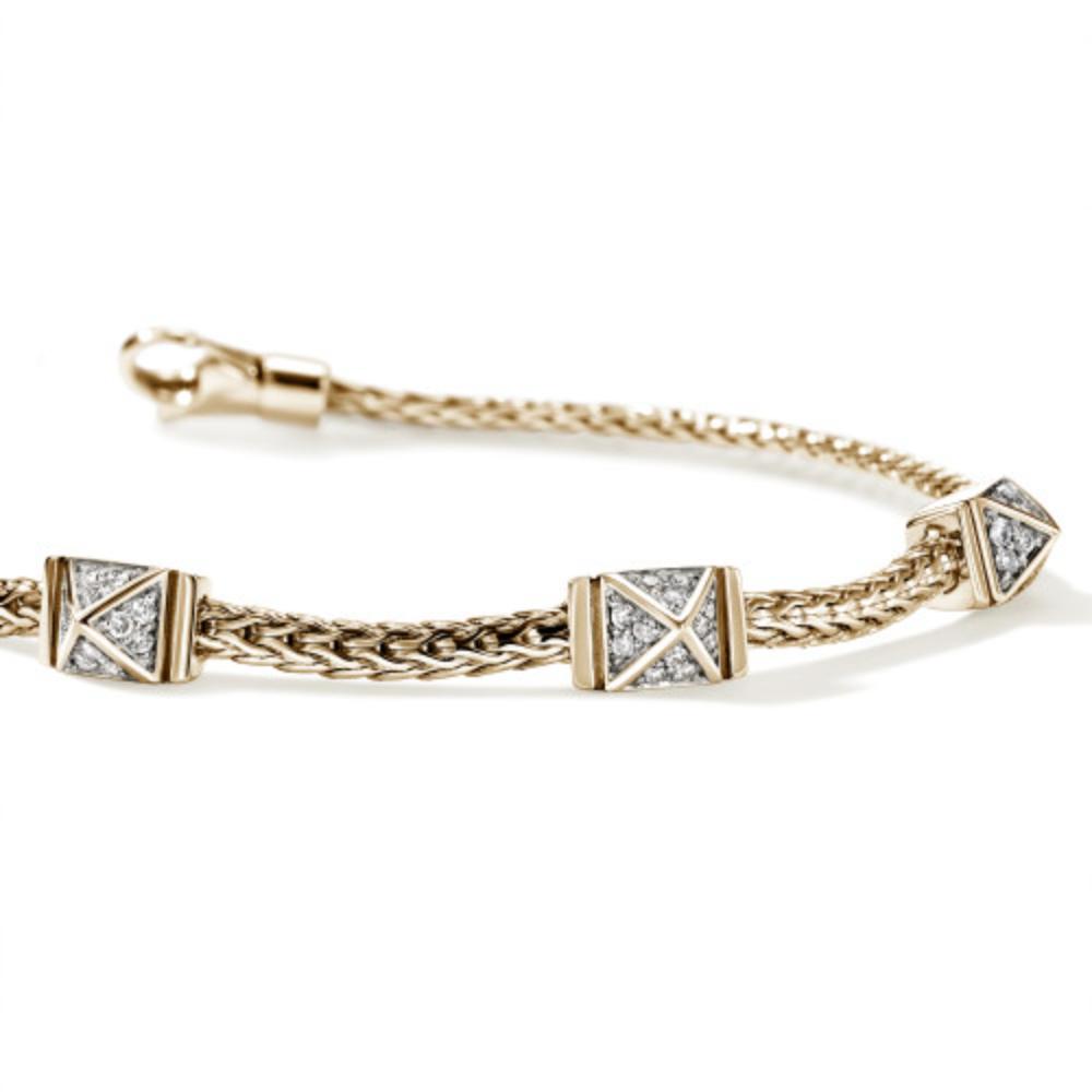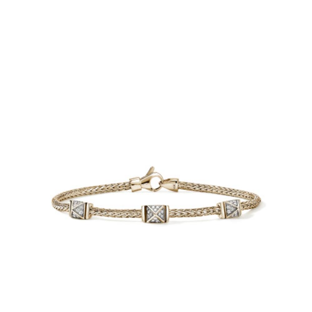 Elevate your everyday elegance with this exquisite John Hardy bracelet, featuring three gleaming diamond pave icon stations totaling 0.21 carats. Each station showcases meticulous craftsmanship with sparkling pavé settings that catch the light beautifully. Strung on a 2.5mm gold woven chain, this piece offers versatile sophistication for both casual and formal occasions. The secure lobster clasp ensures your bracelet stays safely in place throughout the day.