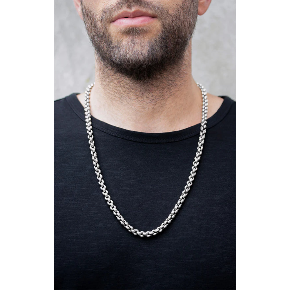 The Sterling Silver Infinity Link Necklace showcases two meticulously hand-carved links crafted from King Baby’s proprietary .925 sterling silver. These links are expertly hand-assembled and interlocked, transforming separate elements into a seamless pattern that embodies unity and endless flow. Each link measures 6.6 mm in width, creating a balanced and refined silhouette. This 24" length necklace is completed with King Baby’s distinctive Loop & Toggle Closure, ensuring both secure wear and signature style. Handmade in the USA, this piece exemplifies superior craftsmanship and enduring design.