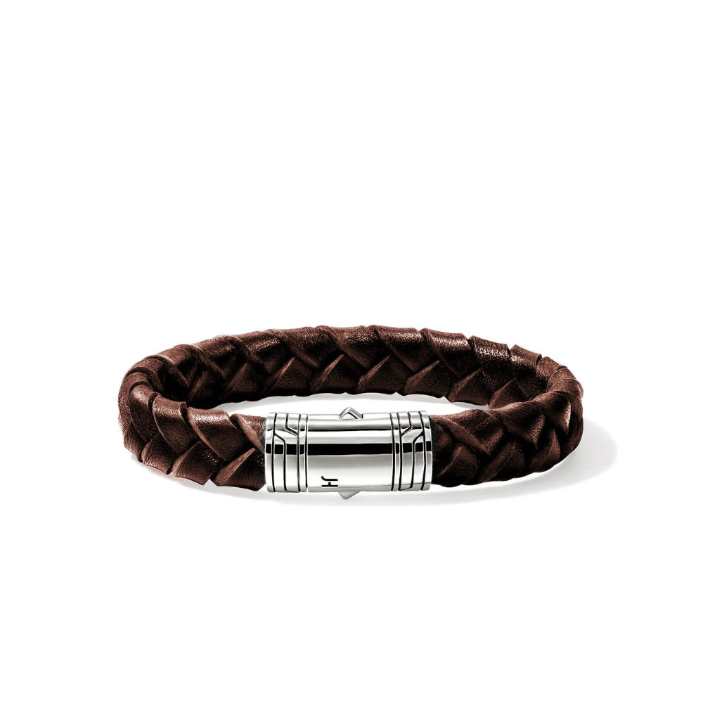 This 10mm handcrafted bracelet combines supple brown leather woven in an intricate braid with a reclaimed sterling silver closure. The pusher clasp features the iconic John Hardy hallmark rendered in carved in black enamel, making it a piece that celebrates both artisanal craftsmanship and timeless design. Large fits wrist size 6.75 - 7.25 in.