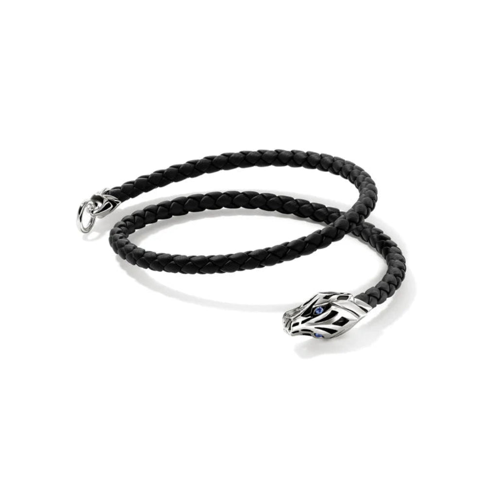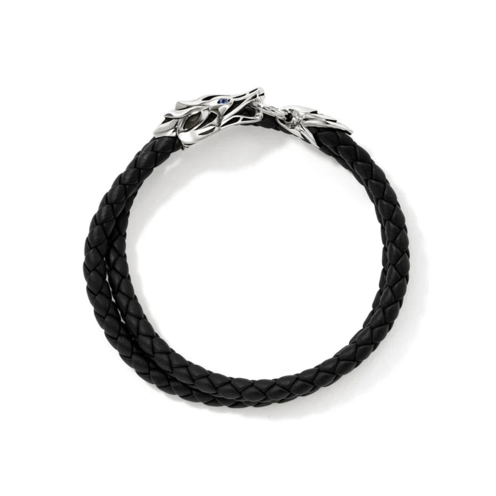 A braided leather bracelet featuring our hand-carved Naga dragon—a legendary symbol of love, protection and prosperity. Artisan handcrafted in reclaimed sterling silver, genuine leather and ethically sourced blue sapphires.