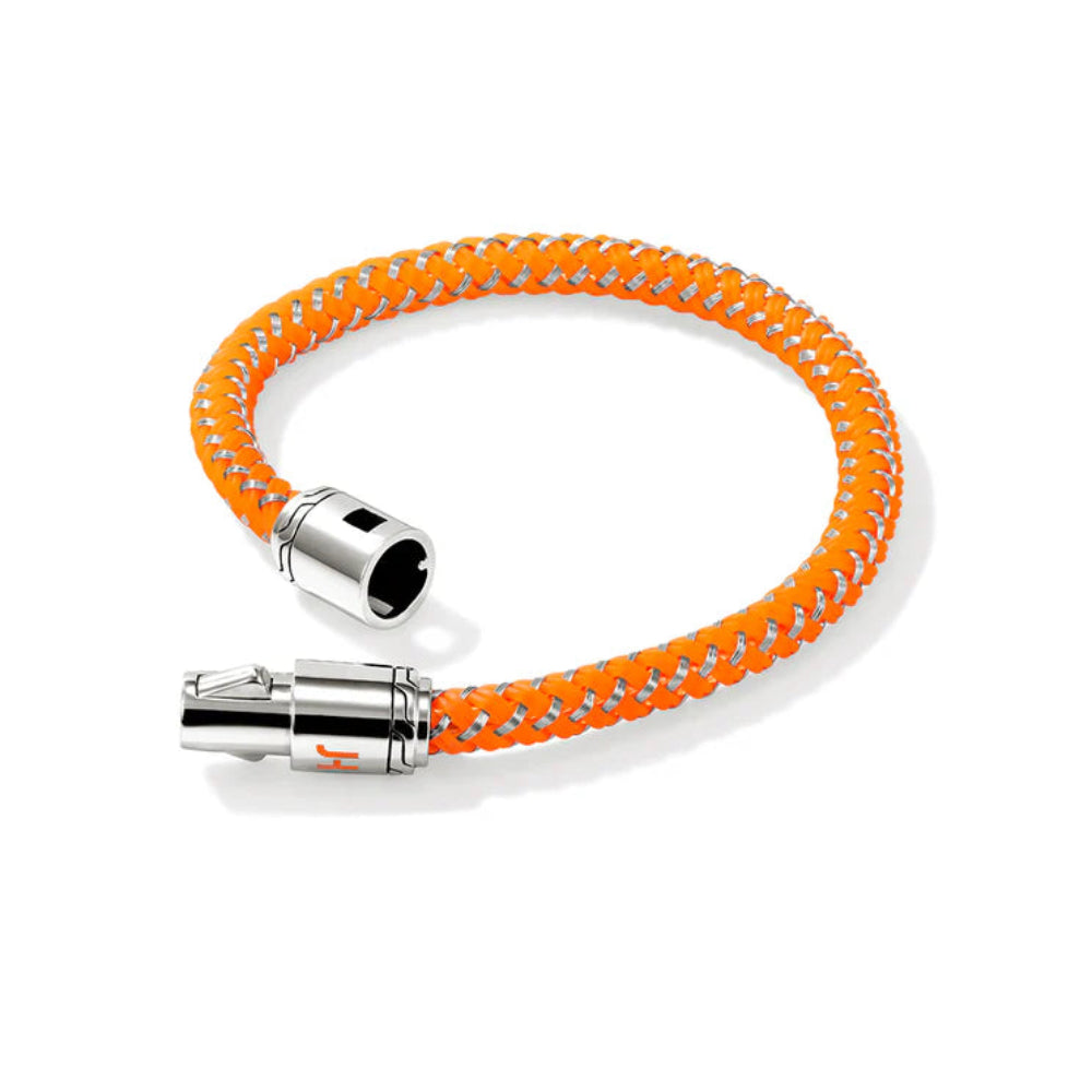 Artisanship meets utility. A rubber and stainless steel woven cord bracelet culminating in a reclaimed sterling silver clasp and accented with the John Hardy hallmark in orange enamel. A sleek form for the perfect stacking companion. Artisan handcrafted.